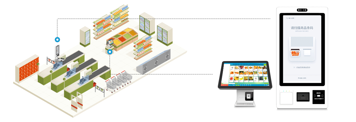 It is mainly used in retail scenes such as supermarkets, convenience stores, and fresh stores. It supports advertising rotation, online payment, self-service coupon printing, and can be configured with lockers