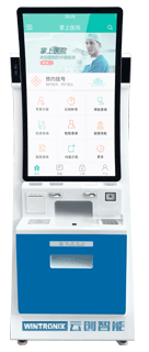 设备主要用于医疗场景的综合自助终端机,用于自助建档发卡、查询、缴费 、挂号、取单等,功能模块丰富,屏幕采用32寸曲面电容屏,美观大气,大小型医院常用款式