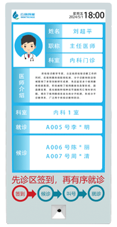 设备主要用于诊室签到、信息显示,如医生信息,就诊状态,排队情况等。轻便易安装,适合各诊室和候诊大厅